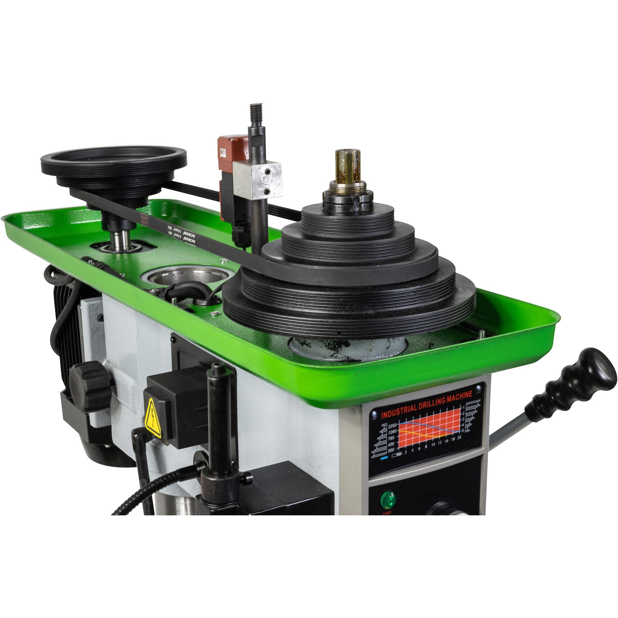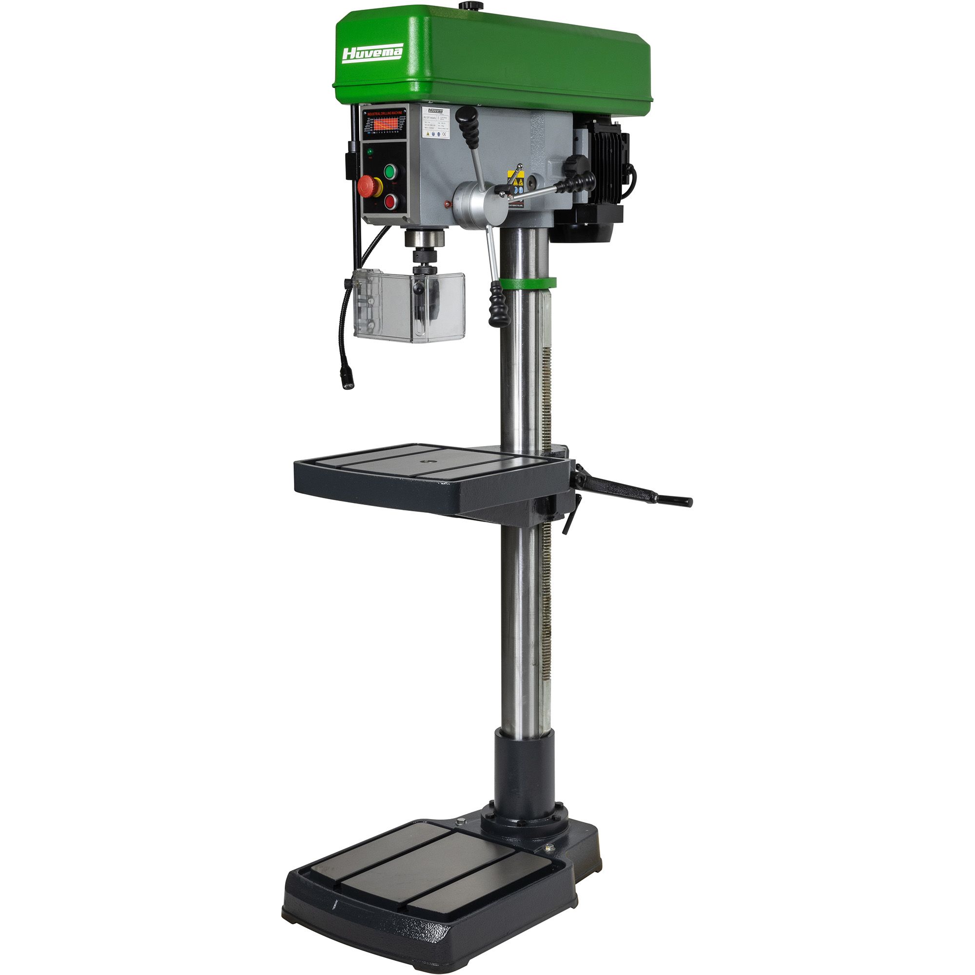 Zwaar uitgevoerde kolomboormachine voor produktie, industrie. De machine is voorzien van spelingsvrije spindel en geschikt voor een produktie opstelling, omdat de kop van de machine op hoogte van een produktie rollenbaan kan worden gesteld. De machine is voorzien van een zware motorplaat en tandriem aandrijving. Dit zorgt voor een zeer laag geluidsniveau en geen trillingen.