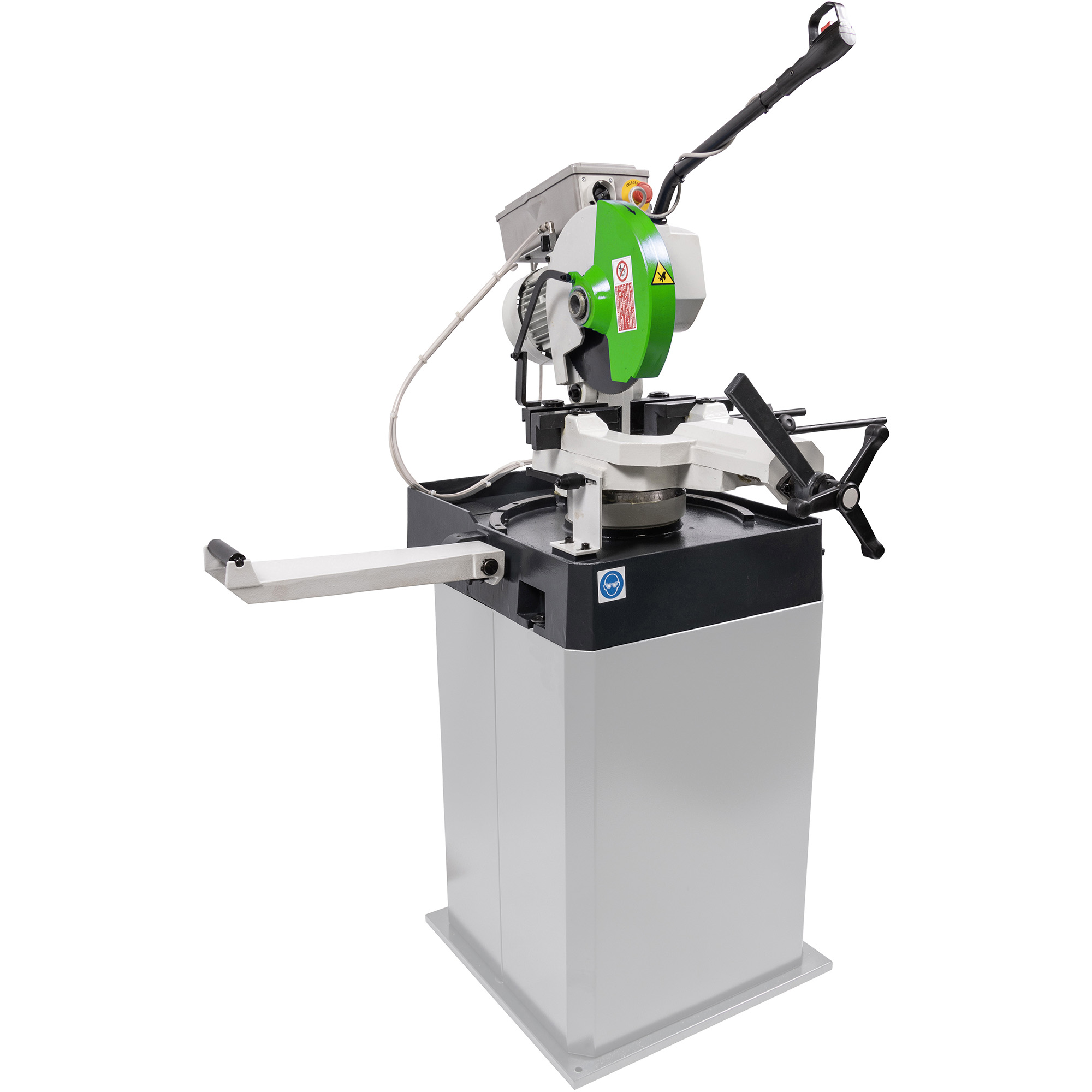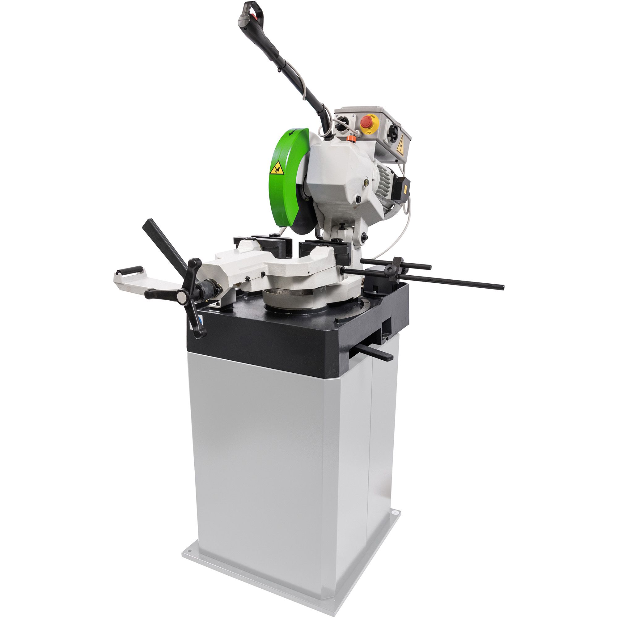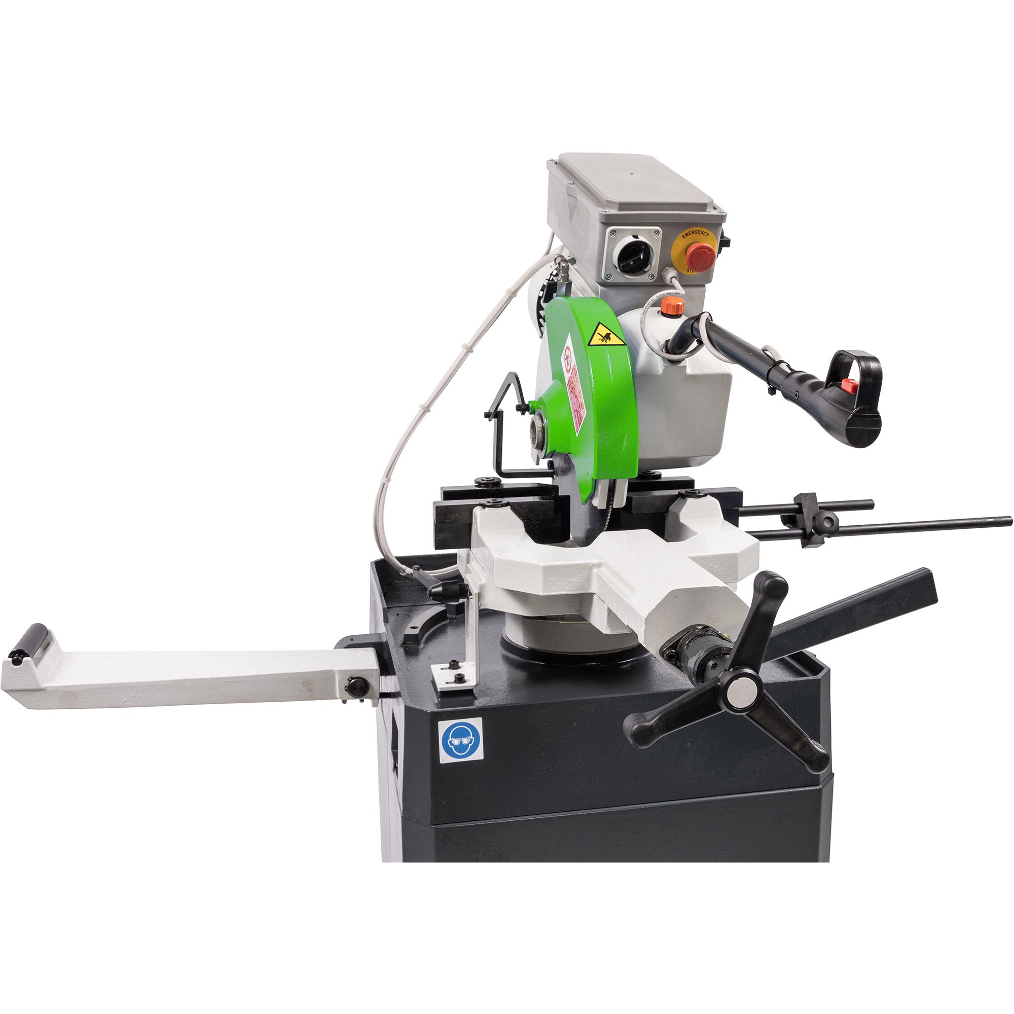 Afkortzaag voor de werkplaats en voor staal- en machinebouw. Door lage toerental ook geschikt voor het zagen van roestvrijstaal. Klem zwenkbaar links en rechts 45º en ook axiaal verstelbaar. Voorzien van oliebad en koelpomp met filter. Dubbele klem voor stevige klemming. Machine voorzien van stuurstroomcircuit. Onderstel als optie.