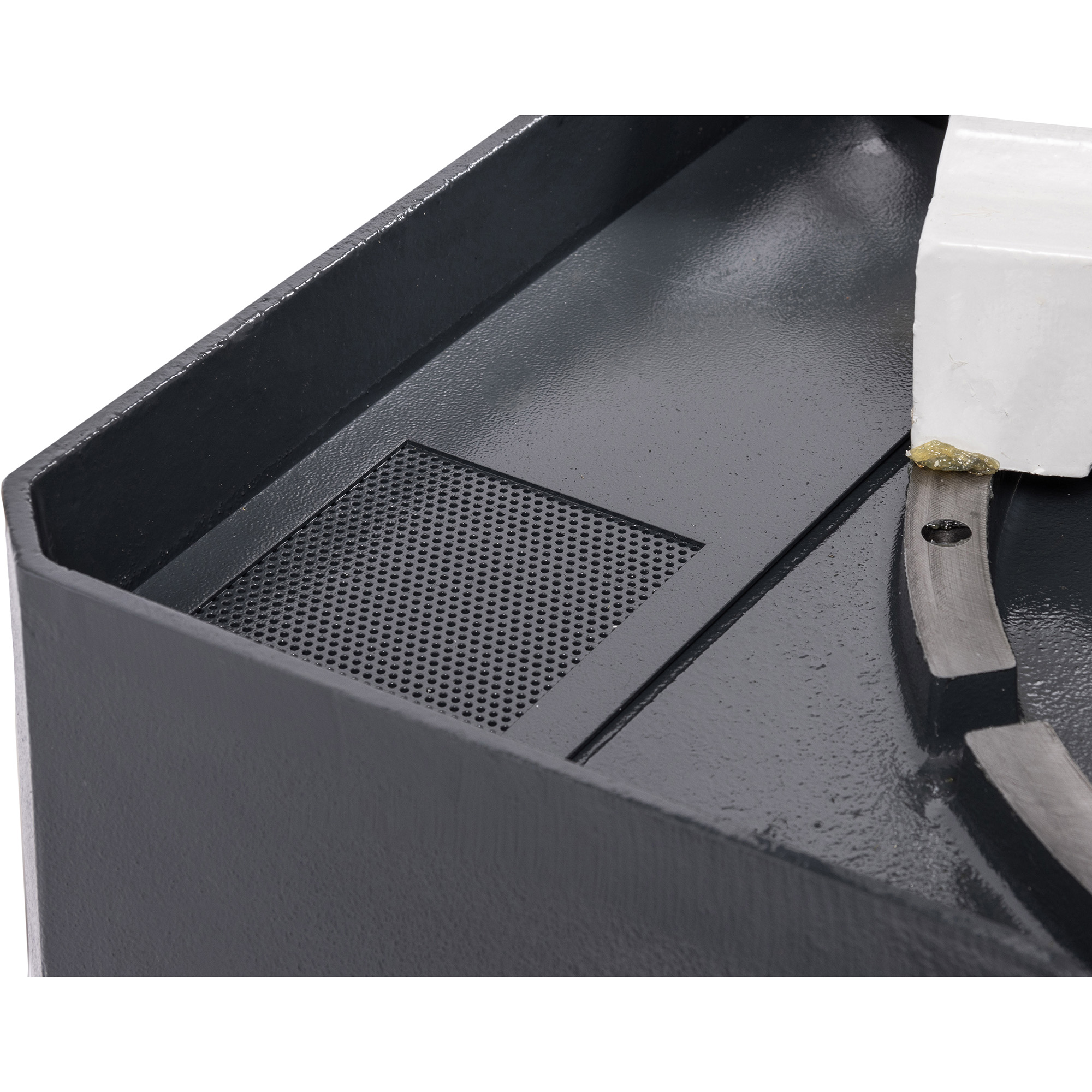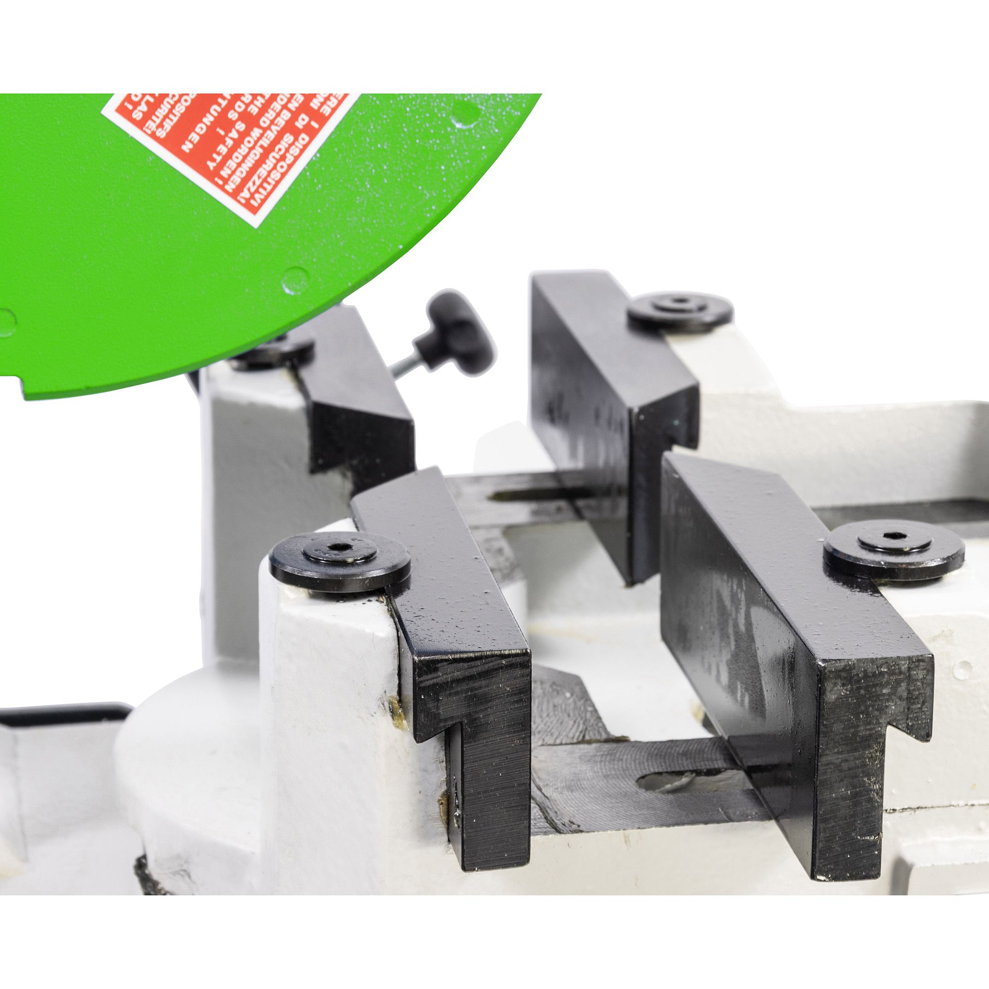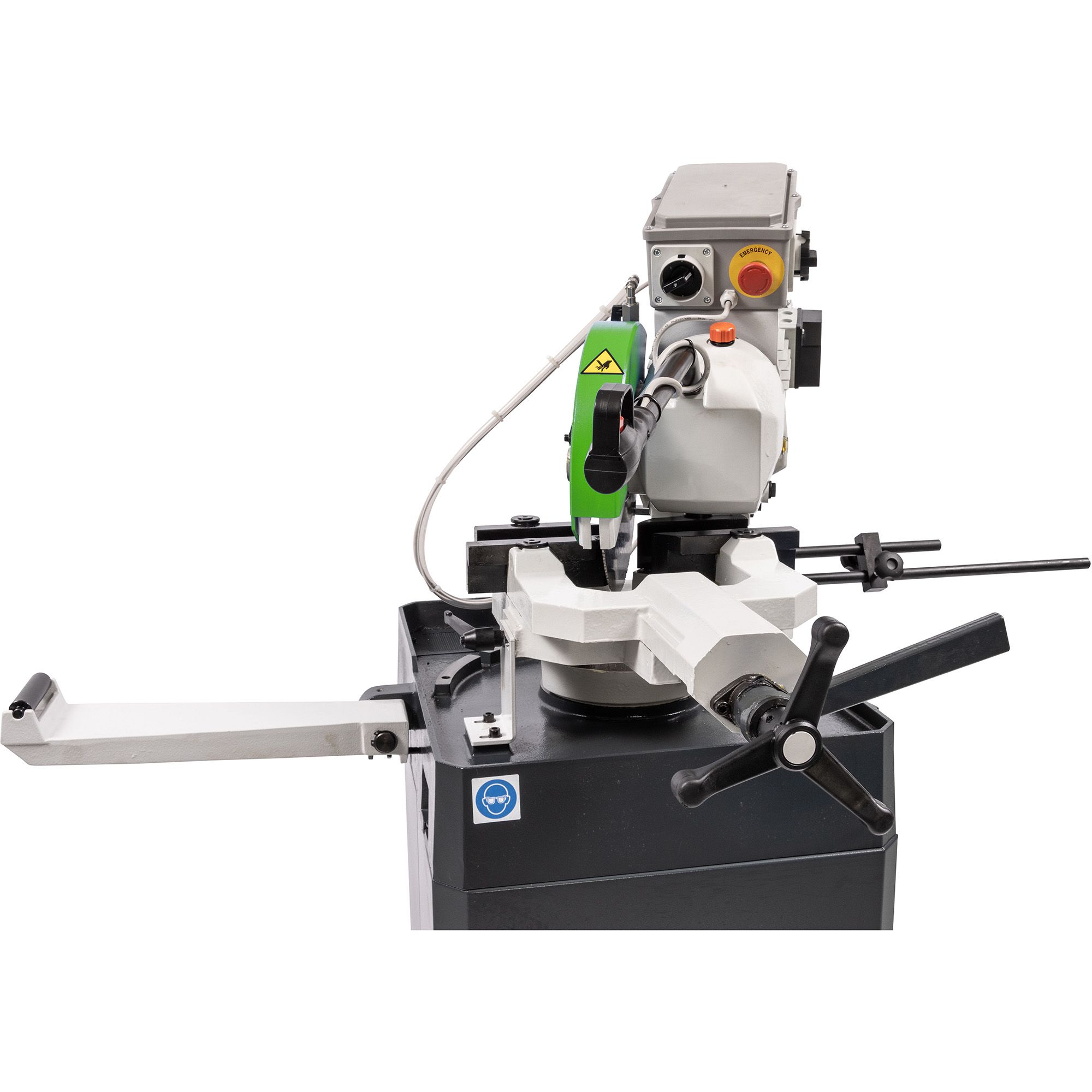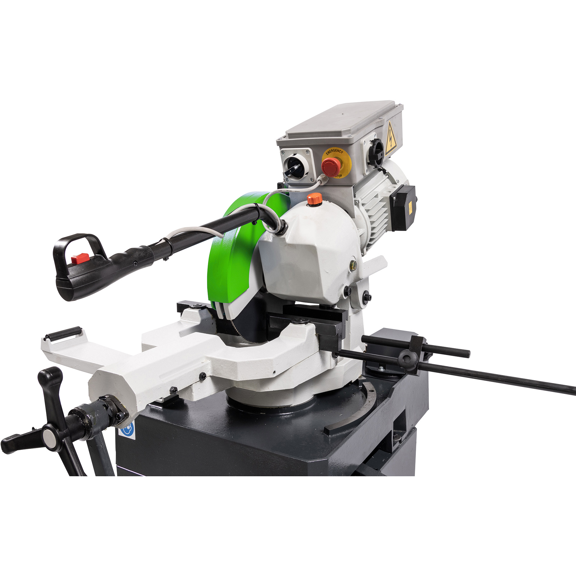 Afkortzaag voor de werkplaats en voor staal- en machinebouw. Door lage toerental ook geschikt voor het zagen van roestvrijstaal. Klem zwenkbaar links en rechts 45º en ook axiaal verstelbaar. Voorzien van oliebad en koelpomp met filter. Dubbele klem voor stevige klemming. Machine voorzien van stuurstroomcircuit. Onderstel als optie.
