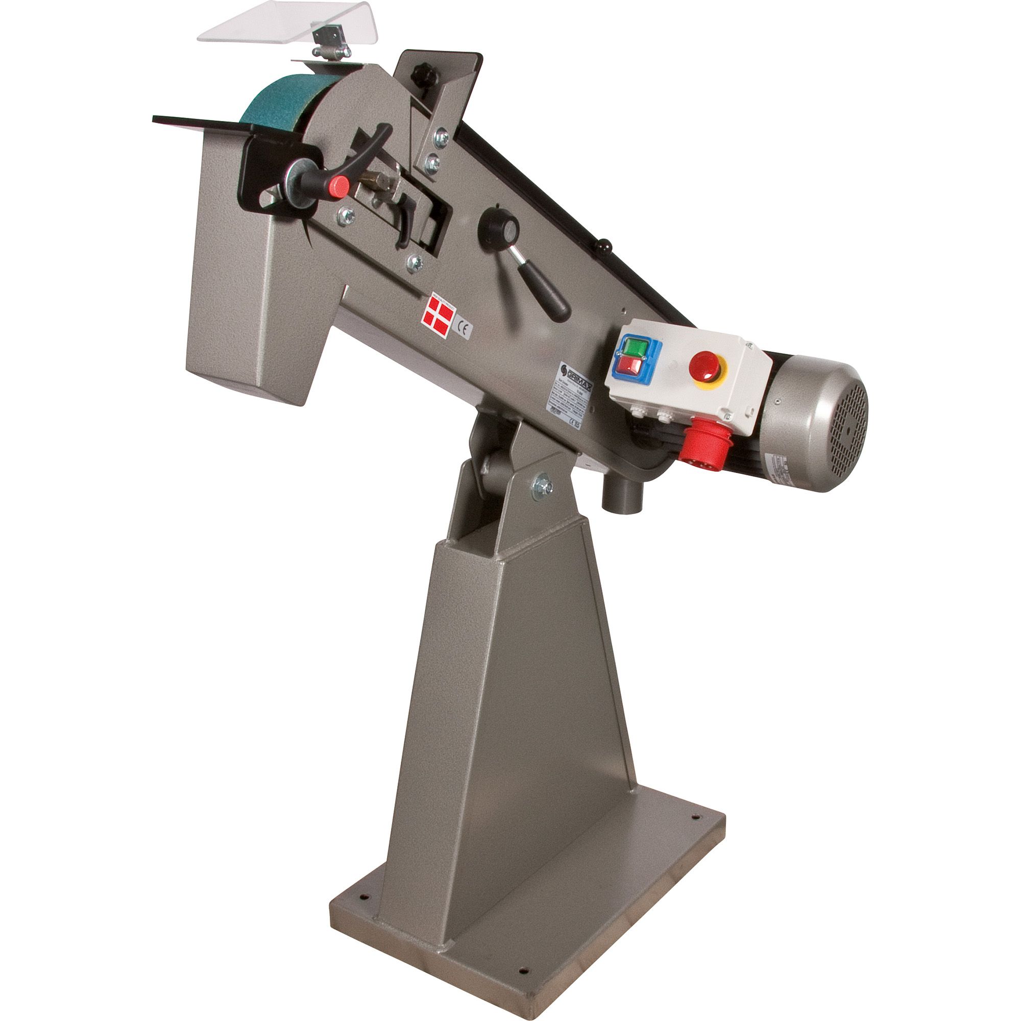 Perfect afgewerkte Europese bandschuurmachine. Deksel over de lange bovenkant gemakkelijk op te slaan voor groot schuuroppervlak. Voorzien van remmotor.